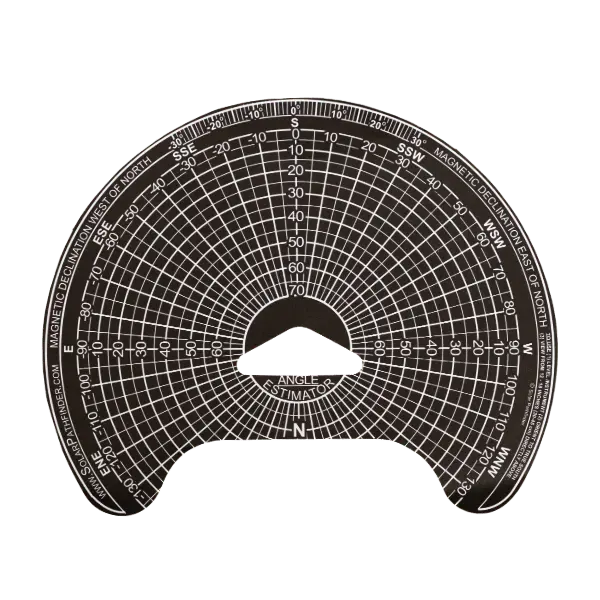Sunpath diagrams and angle estimators help approximate the azimuth and elevation of shading objects reflected in the Solar Pathfinder™ dome. Clear grid and paper options assist with manual site assessments and regulatory forms. Diagrams are latitude- and application-specific and mix-and-match pricing is available. Each Solar Pathfinder™ includes 20 free diagrams; bulk pricing and replacements are also offered.